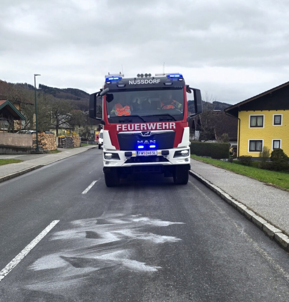 Am 04.04.2026 wurde die Feuerwehr Nußdorf zu einer großflächigen Ölspur alarmiert, die sich über das gesamte Gemeindegebiet erstreckte. Auch die angrenzenden Bereiche Oberndorf, Laufen und Göming waren von der Verunreinigung