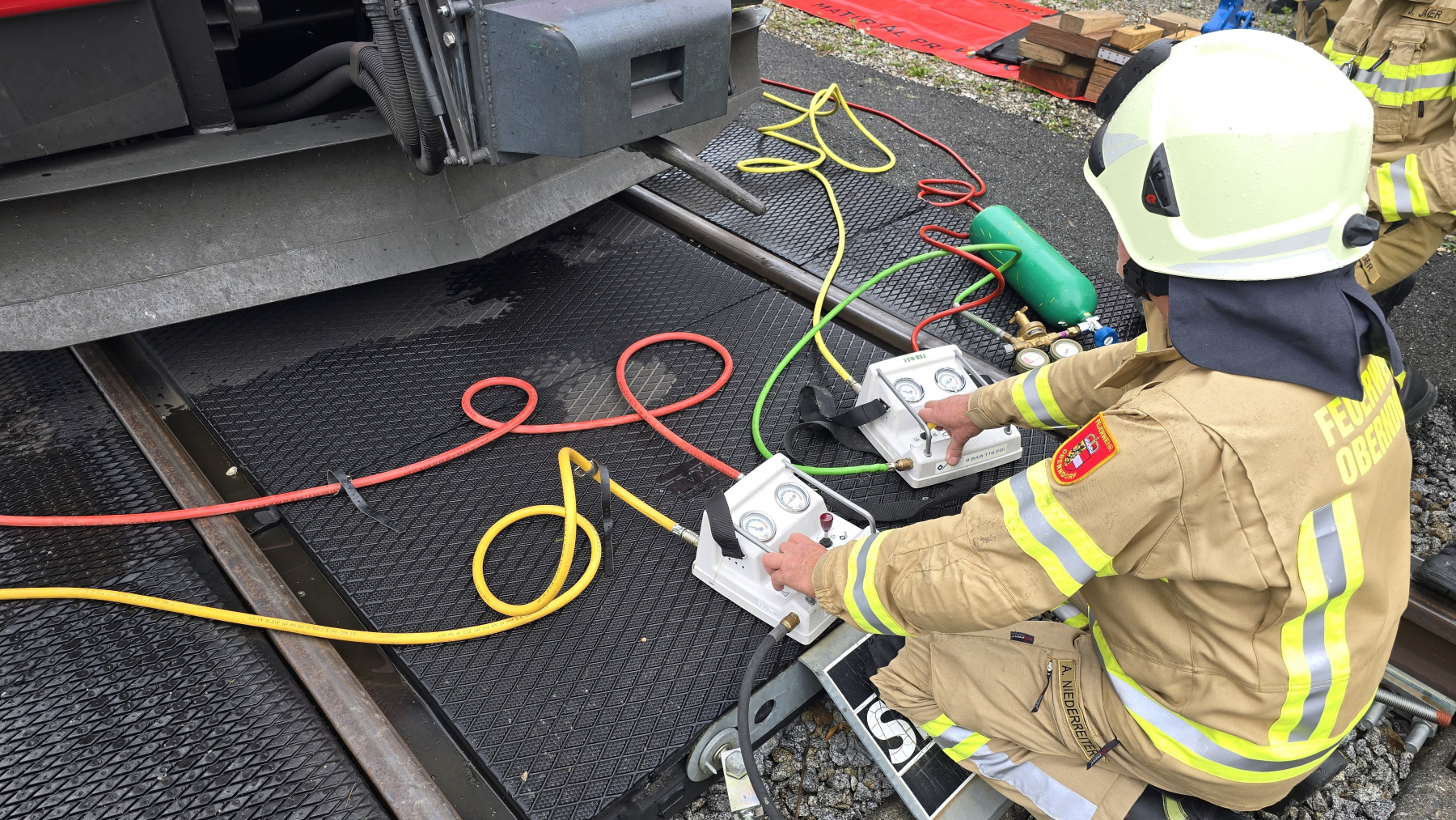 Gemeinsam mit der Einsatzleitung der Lokalbahn wurde an einer auf dem Stumpfgleis abgestellten Triebwagengarnitur die Hebepunkte erkundet. Im nächsten Schritt wurden die verschiedenen in Frage kommenden Gerätschaften (Hebekissen, Hydraulikstempel, Hubwinde, und LKW-Wagenheber) ausgewählt und nacheinander erfolgreich versucht, den Triebwagen am Kopfende entsprechend anzuheben. Dabei kam man zur Erkenntnis, dass vor allem die Höhe vom Boden bis zum Hebepunkt entscheidend ist, welches Gerät sich wie, je nach Lage optimal einsetzen lässt.