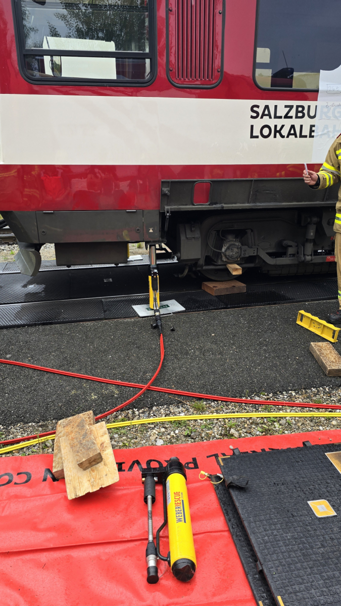 Gemeinsam mit der Einsatzleitung der Lokalbahn wurde an einer auf dem Stumpfgleis abgestellten Triebwagengarnitur die Hebepunkte erkundet. Im nächsten Schritt wurden die verschiedenen in Frage kommenden Gerätschaften (Hebekissen, Hydraulikstempel, Hubwinde, und LKW-Wagenheber) ausgewählt und nacheinander erfolgreich versucht, den Triebwagen am Kopfende entsprechend anzuheben. Dabei kam man zur Erkenntnis, dass vor allem die Höhe vom Boden bis zum Hebepunkt entscheidend ist, welches Gerät sich wie, je nach Lage optimal einsetzen lässt.