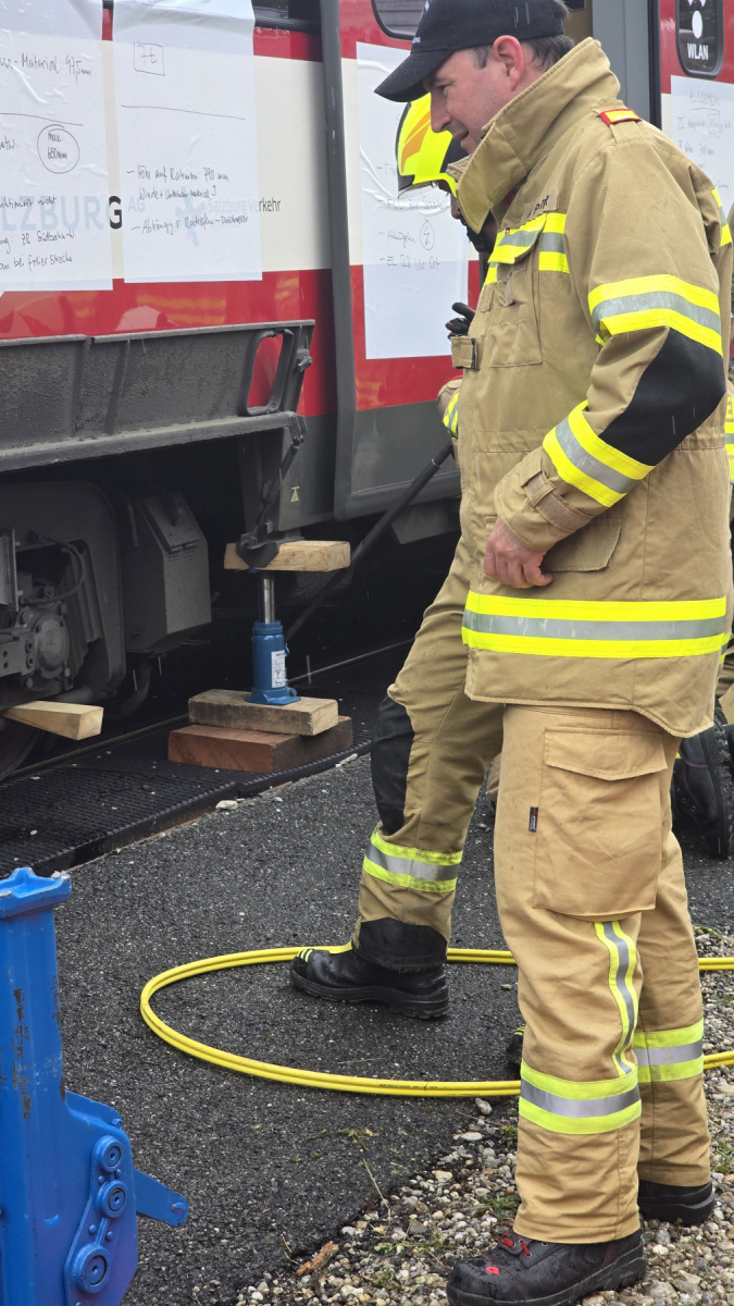 Gemeinsame Übung der FF Nußdorf, Oberndorf, Bergheim, Salzburg-AG und BF Salzburg bei der Lokalbahnhaltestelle Weitwörth: Hebeversuch an einer Lokalbahngarnitur. Zudem anwesend: Fr. Bgm. Waltraud Brandstetter, AFK Pitter Andreas, BFK Klaus Lugstein, Kameraden der FF Anthering, Bürmoos und St. Georgen.