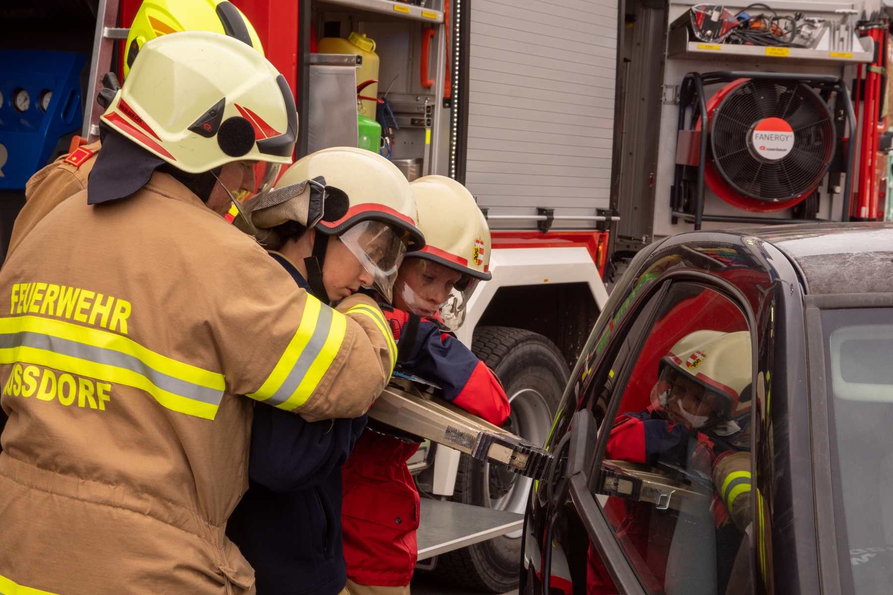 Schnell schnappten die Jugendmitglieder ihre Uniform und sprangen in die Fahrzeuge. Es handelte sich um einen Verkehrsunfall. Bei dieser Einsatzübung konnten drei Personen aus zwei verunfallten PKW von der Jugendgruppe gerettet werden. Mit Unterstützung aktiver Mitglieder und des Roten Kreuzes konnten die Kinder und Jugendlichen mit Spreizer und Schere die geschlossenen Autotüren öffnen und die Patientinnen schonend befreien. Dabei erhielten sie gleichzeitig eine Schulung von den Rettungskräften des Roten Kreuzes.