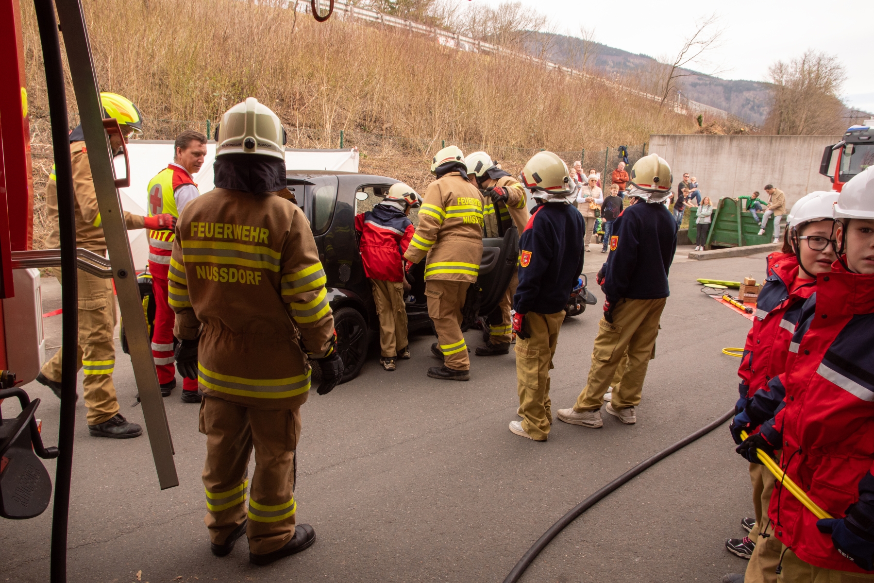 Schnell schnappten die Jugendmitglieder ihre Uniform und sprangen in die Fahrzeuge. Es handelte sich um einen Verkehrsunfall. Bei dieser Einsatzübung konnten drei Personen aus zwei verunfallten PKW von der Jugendgruppe gerettet werden. Mit Unterstützung aktiver Mitglieder und des Roten Kreuzes konnten die Kinder und Jugendlichen mit Spreizer und Schere die geschlossenen Autotüren öffnen und die Patientinnen schonend befreien. Dabei erhielten sie gleichzeitig eine Schulung von den Rettungskräften des Roten Kreuzes.