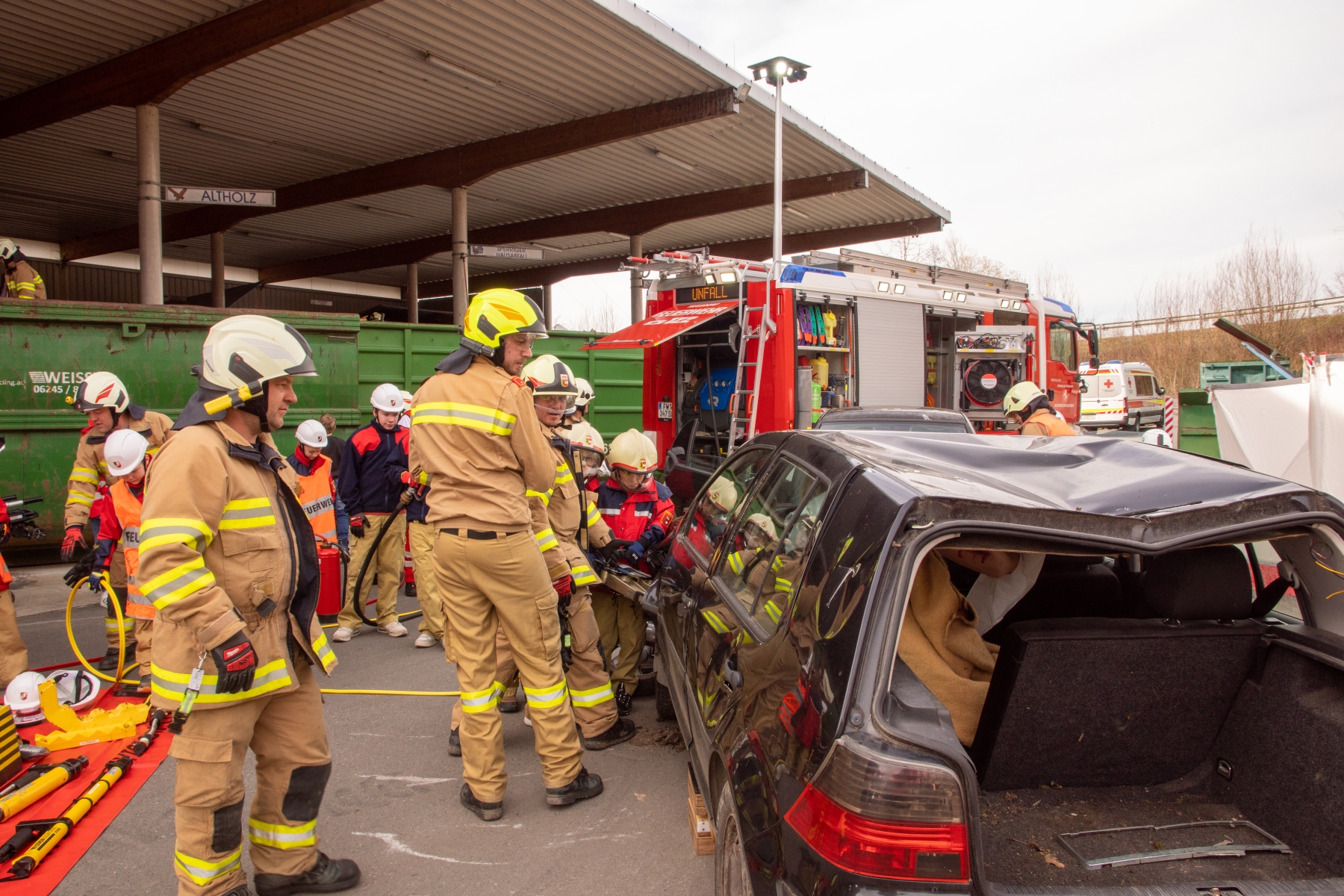 Schnell schnappten die Jugendmitglieder ihre Uniform und sprangen in die Fahrzeuge. Es handelte sich um einen Verkehrsunfall. Bei dieser Einsatzübung konnten drei Personen aus zwei verunfallten PKW von der Jugendgruppe gerettet werden. Mit Unterstützung aktiver Mitglieder und des Roten Kreuzes konnten die Kinder und Jugendlichen mit Spreizer und Schere die geschlossenen Autotüren öffnen und die Patientinnen schonend befreien. Dabei erhielten sie gleichzeitig eine Schulung von den Rettungskräften des Roten Kreuzes.