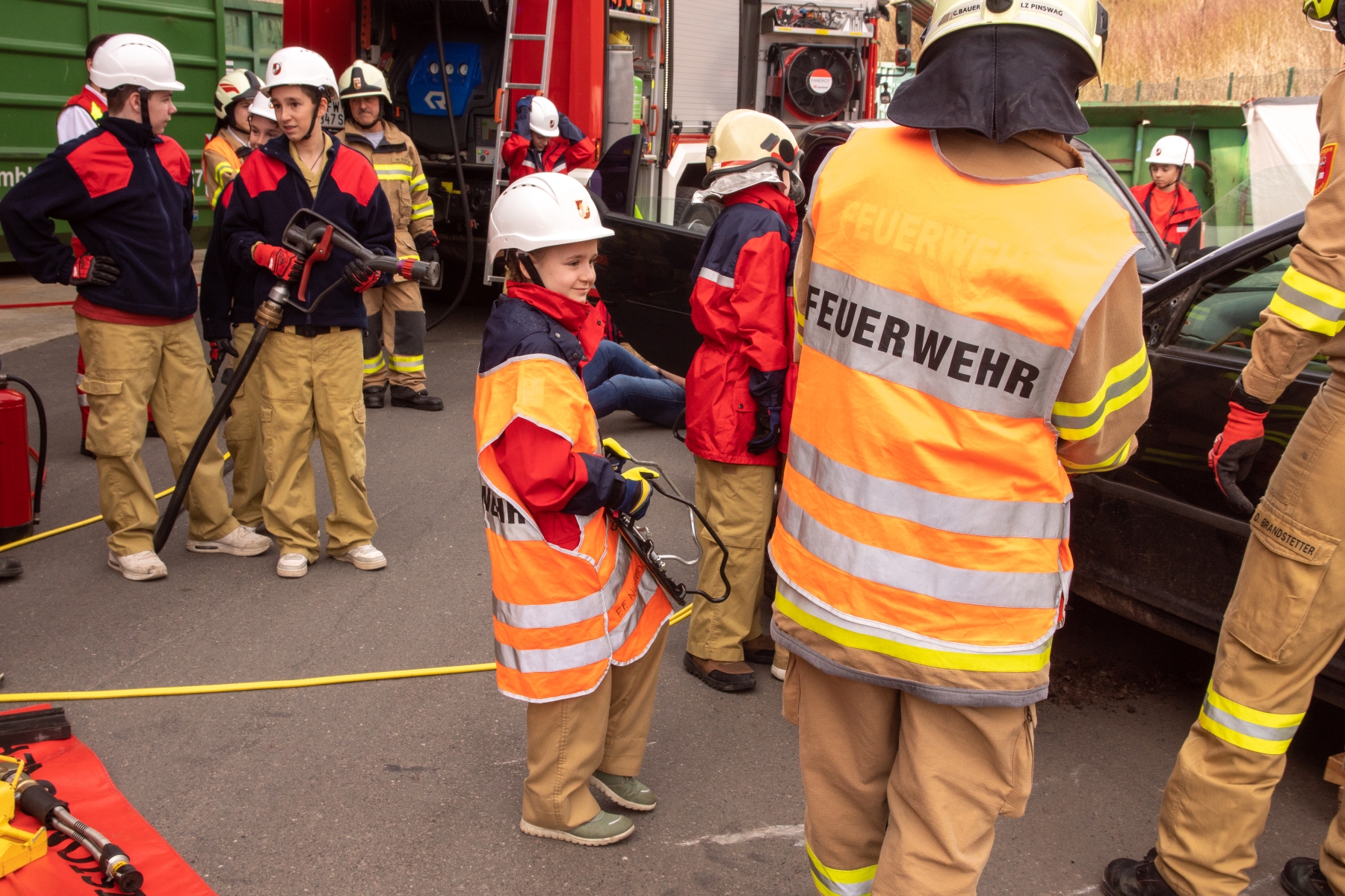 Schnell schnappten die Jugendmitglieder ihre Uniform und sprangen in die Fahrzeuge. Es handelte sich um einen Verkehrsunfall. Bei dieser Einsatzübung konnten drei Personen aus zwei verunfallten PKW von der Jugendgruppe gerettet werden. Mit Unterstützung aktiver Mitglieder und des Roten Kreuzes konnten die Kinder und Jugendlichen mit Spreizer und Schere die geschlossenen Autotüren öffnen und die Patientinnen schonend befreien. Dabei erhielten sie gleichzeitig eine Schulung von den Rettungskräften des Roten Kreuzes.