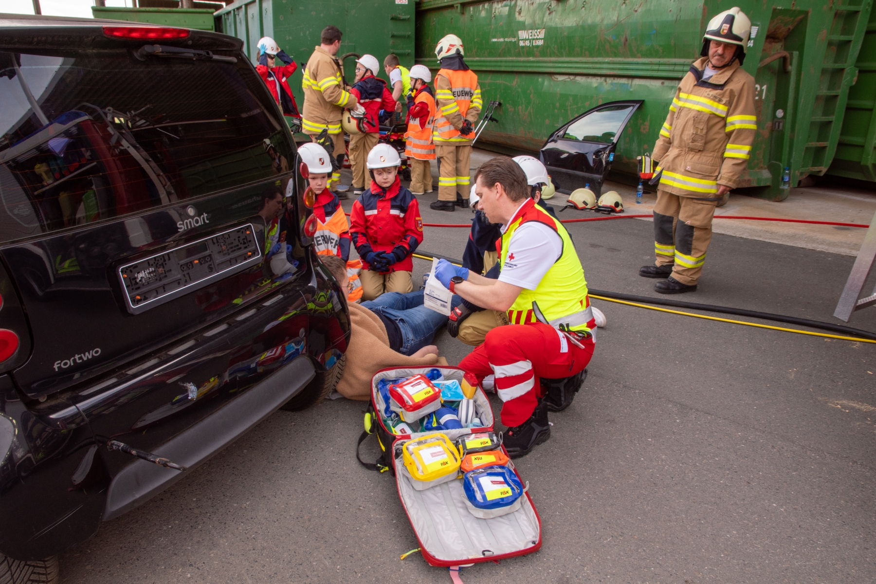 Schnell schnappten die Jugendmitglieder ihre Uniform und sprangen in die Fahrzeuge. Es handelte sich um einen Verkehrsunfall. Bei dieser Einsatzübung konnten drei Personen aus zwei verunfallten PKW von der Jugendgruppe gerettet werden. Mit Unterstützung aktiver Mitglieder und des Roten Kreuzes konnten die Kinder und Jugendlichen mit Spreizer und Schere die geschlossenen Autotüren öffnen und die Patientinnen schonend befreien. Dabei erhielten sie gleichzeitig eine Schulung von den Rettungskräften des Roten Kreuzes.