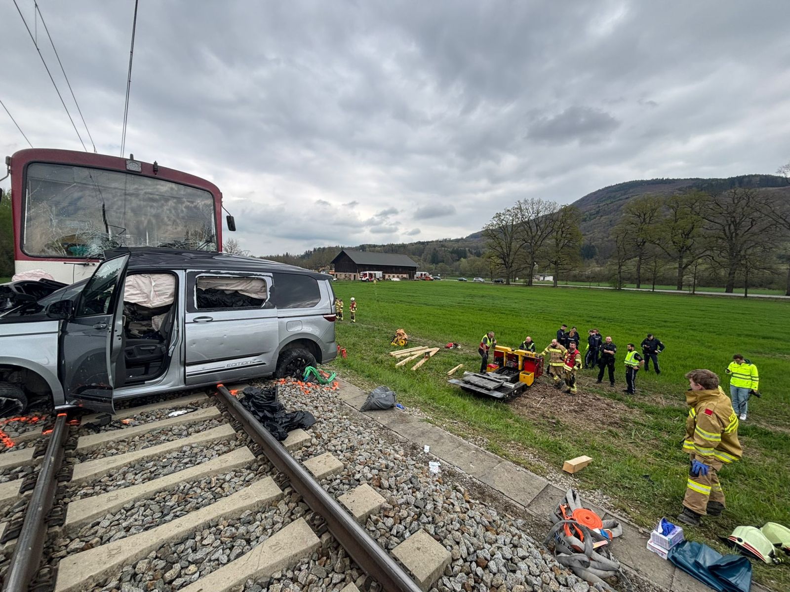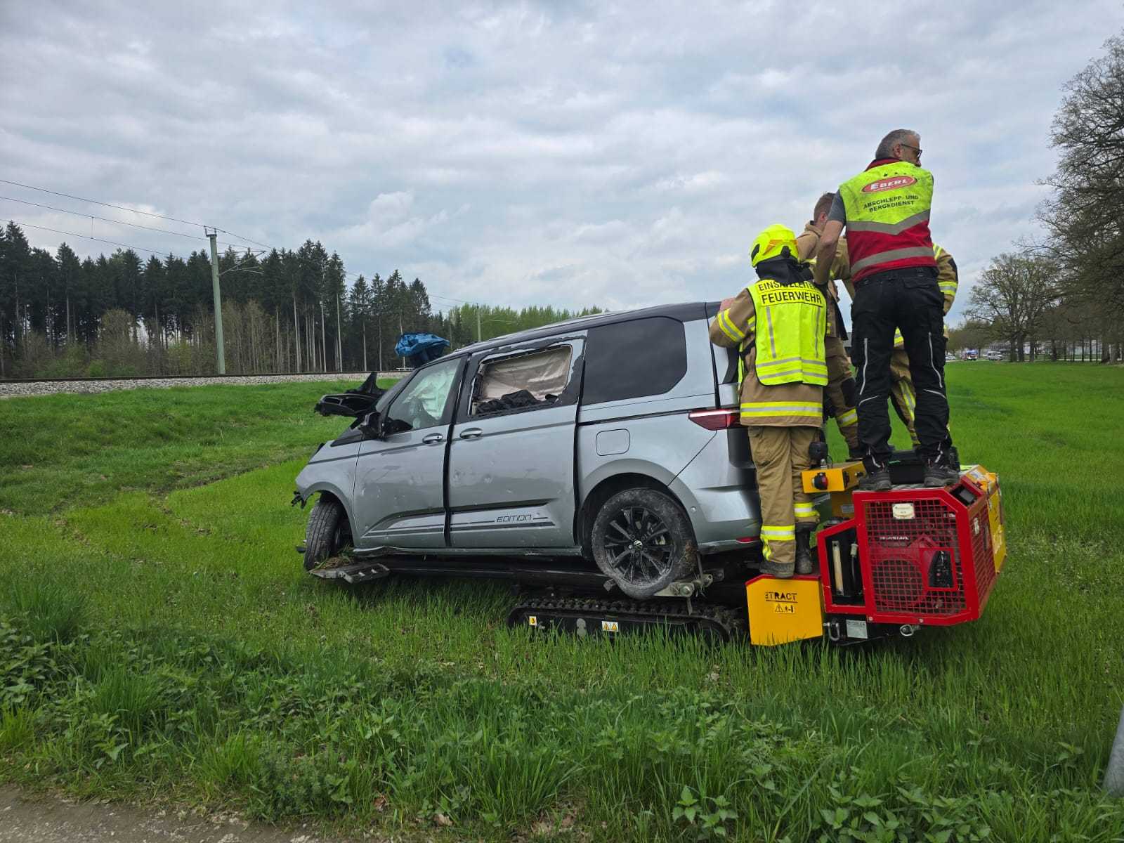 Die Bergung des stark beschädigten Fahrzeugs gestaltete sich aufwendig. In Zusammenarbeit mit einem Bergeunternehmen musste der PKW mittels eines Raupenfahrzeugs vorsichtig aus dem Gleisbereich entfernt werden.
