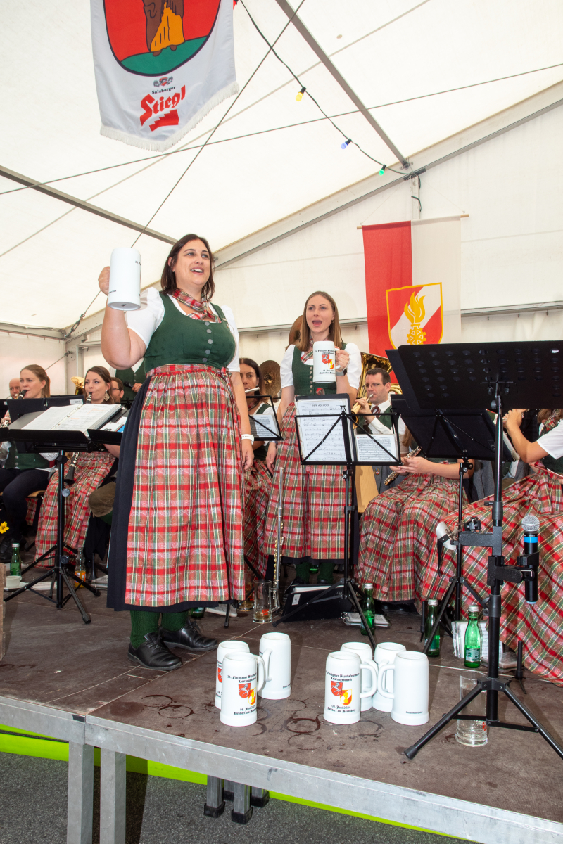 Am Sonntagmorgen wurde frühzeitig für den Frühschoppen umgerüstet. Zwar war es früher üblich, dass das Zelt direkt nach dem Kirchgang gut gefüllt war, doch ab halb elf strömten die Gäste zahlreich herbei. Bald war das Festzelt bis auf den letzten Platz gefüllt.
