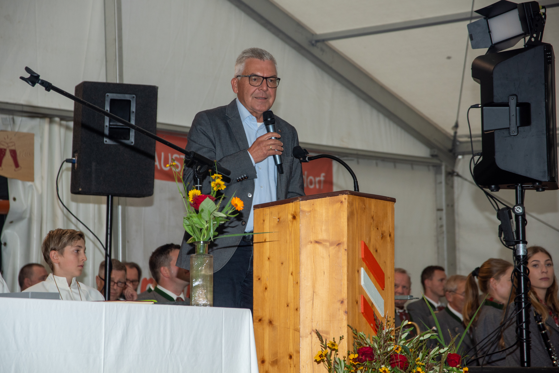 Ursprünglich war die Segnung des neuen LFA am Parkplatz des Altwirtes geplant. Doch das Wetter machte uns leider einen Strich durch die Rechnung: Dauerregen war angekündigt. Kurzerhand wurde der Festakt ins Festzelt verlegt – der Stimmung tat das jedoch keinen Abbruch.